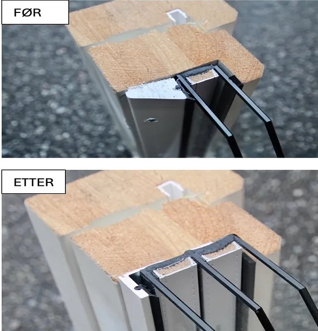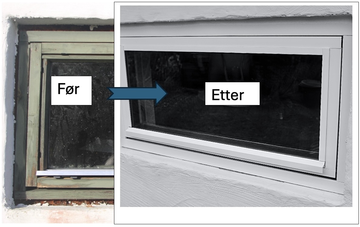 Før- og etter oppgradering med nytt trelagsglass og ettermontert vedlikeholdsfri aluminiumskledning på utsiden av vinduskarm/ramme.