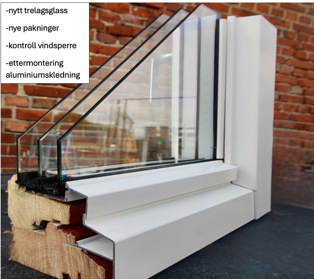 Ved å bare bytte ut det gamle tolagsglasset, og sette inn et moderne trelags lavenergiglass (u-verdi 0,5), blir vinduende like isolerende som du får ved å sette inn komplette nye.